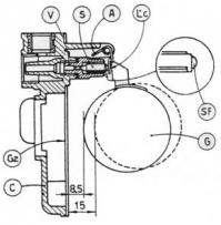 - With carburetor cover (C) in vertical position and float clip (Lc) in light contact with the pin ball (Sf) of the needle (S), the distance of both half¬floats (G) from upper surface of carburetor cover (C), without gasket, must measure 8.5mm.
