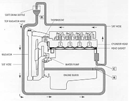 Join an extra length of hose onto the heater core outlet that previously ran to the pump (See diagram, Point C) and put this hose into the top of the bottle.