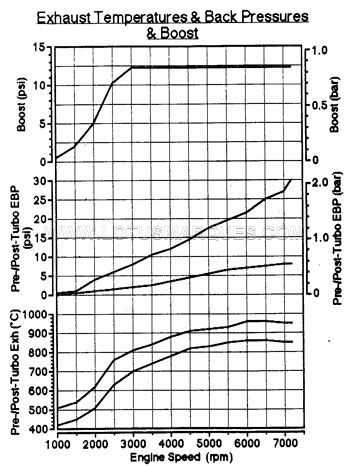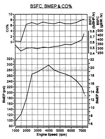 BMEP peaks at 20.6 bar (4000 rpm), where a BSFC of 300 gm/kw hr is recorded. At higher engine speeds a gradually increasing richer mixture is used to control exhaust gas temperature to a peak of 980° C. This can be seen by the change in slope of the exhaust temperature curves, and the consequential increase in BSFC.
