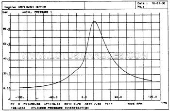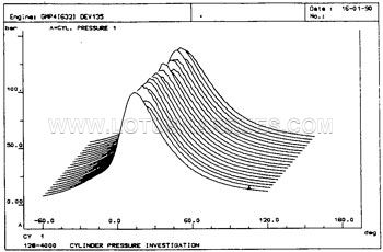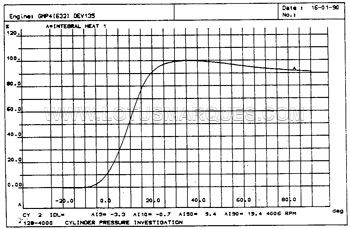Obviously these outputs result in considerable mechanical and thermal loadings. The peak cylinder pressure is typically in the range of 90-100 bar and cyclic irregularity is well controlled. This is demonstrated in the waterfall plot showing 20 consecutive cylinder events. The high pressure is achieved without severe rates of pressure rise, as may be seen from the pressure diagram, and mass fraction burnt curve. Peak pressure is recorded at 16-18° after TDC and 90% mass burnt by 20° ATDC.